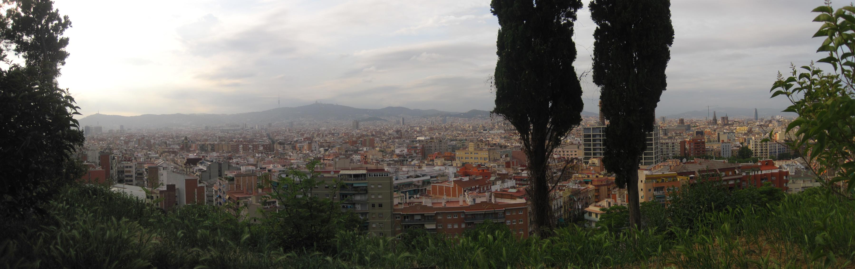 Above and overlooking the city is the hill of Montjuรฏc, where the 1992 Summer Olympics was held. We stopped there to see the city in the golden hour of early evening, and I took a panoramic shot of the skyline: